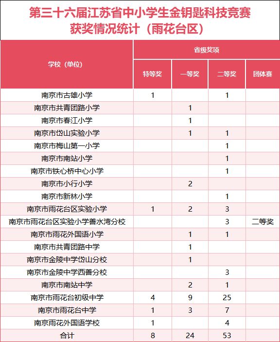 在第三十六届江苏省中小学生金钥匙科技竞赛中,雨花台区成绩优异,获省级个人特等奖8个、一等奖24个、二等奖53个,团体赛二等奖1个、先进学校5个;雨花台区教育局被评为先进单位。