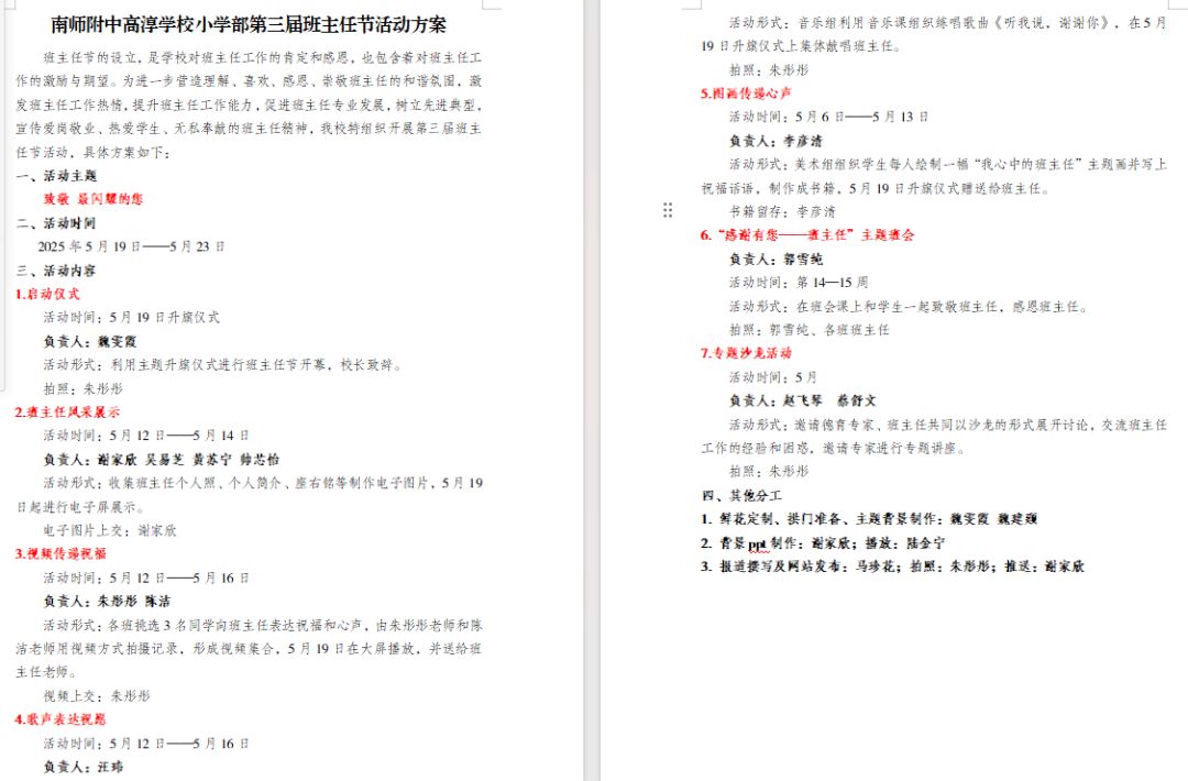 班主任是学校工作的中坚力量,是学生健康成长的引路人。为进一步营造理解、喜欢、感恩、崇敬班主任的和谐氛围,我校小学部特组织开展第三届班主任节活动。德育处精心策划了《南师附中高淳学校小学部第三届班主任节活动方案》,各学科老师通力合作,为班主任节的到来做好精心准备。