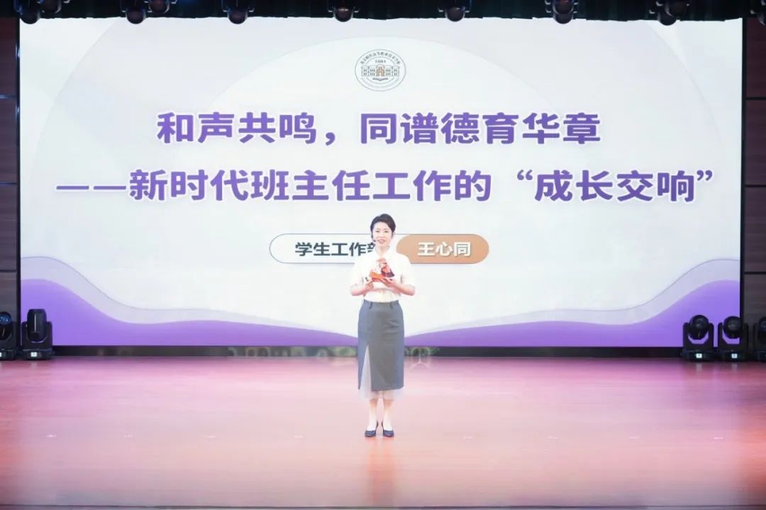 学生工作部副主任王心同以《和声共鸣,同谱德育华章——新时代班主任工作的“成长交响”》为主题,系统介绍了在班主任队伍培养、特色育人模式探索等方面的创新举措与显著成效。报告通过“厚植情怀、动静策略、系统培养、同频共振”四个乐章,展现了学校构建的立体化班主任培养体系:以“明德尚美”校训为引领,通过“教育家精神”系列讲座、系部特色培训、班主任能力比赛等多元平台,打造“身边榜样”引领机制。通过不断探索实践,工作室已形成了“全员参与、梯次成长”的德育工作新格局,奏响了新时代职业院校立德树人的动人乐章。