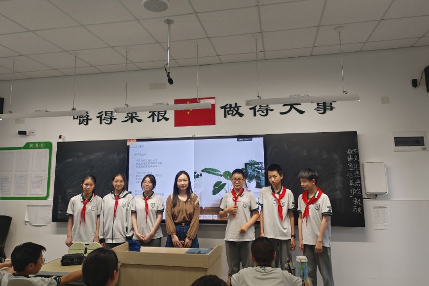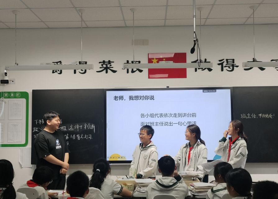 在“心声传递”环节,全班以8个学习小组为单位,每组推选一名代表上台,用饱含深情的话语向班主任表达敬意。有的小组感恩老师在学业上的悉心指导,有的小组倾诉老师在生活中的暖心陪伴,质朴的语言里藏着最真挚的情感。每组发言后,全班齐唱《夜空中最亮的星》片段,让感恩的旋律在教室里静静流淌。