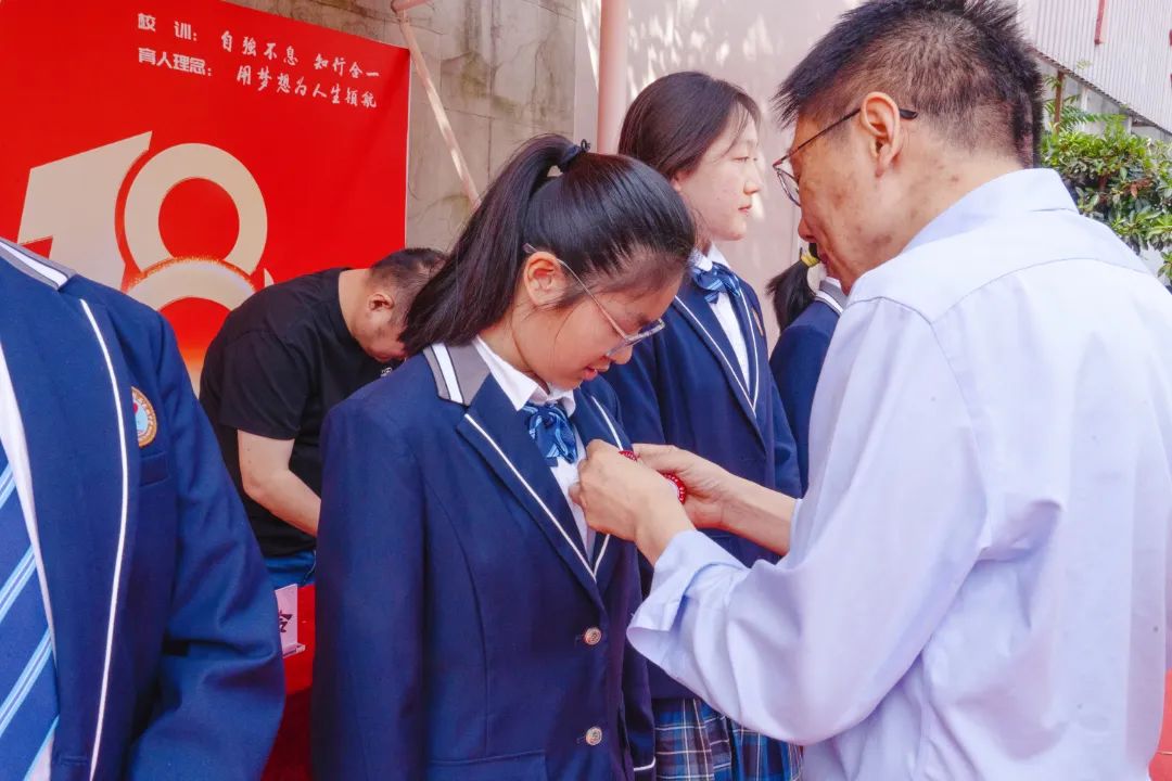 紧接着,王兰校长与张群副校长向学生代表授予成人徽章,家长为孩子们佩戴成人徽章。这枚徽章不仅是成年的象征,更是学生们人生中一个重要的里程碑。